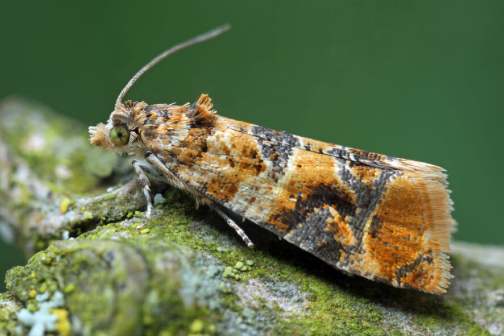medir entre 10 y 13 mm. Su primer par de alas es jaspeado, con manchas oscuras en marrón alternando con